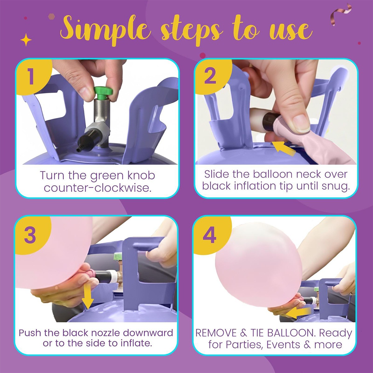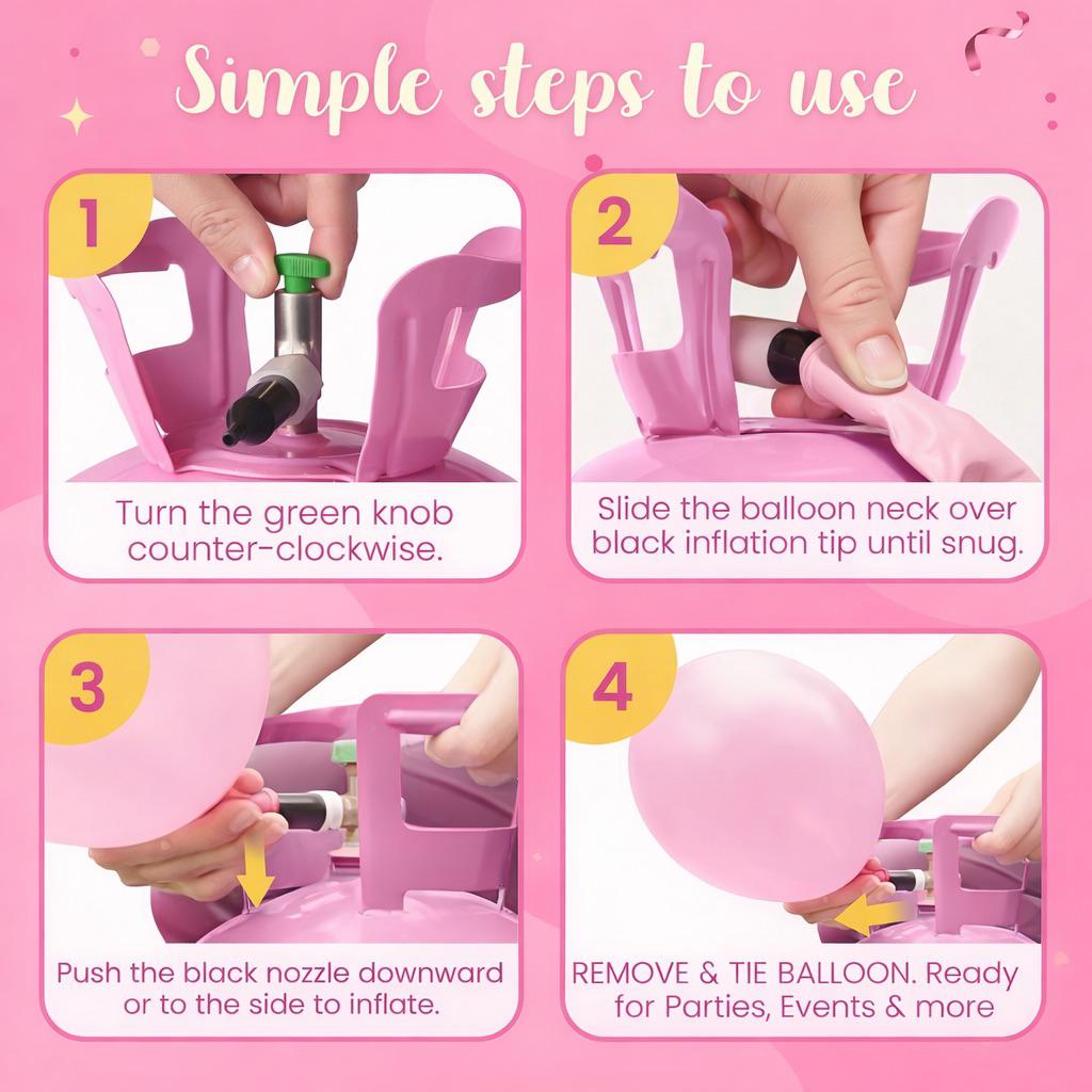 Attach your balloon to the built-in valve and inflate with full control using the simple on/off mechanism. Our 99.99% pure helium ensures smooth, consistent inflation every time.